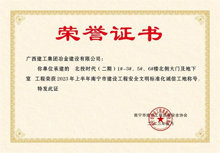 在項目黨支部全體黨員的共同努力下,項目榮獲了業(yè)主頒發(fā)的“2022年度優(yōu)秀總承包單位”和“工程施工類優(yōu)質(zhì)供應(yīng)商獎”獎項,2023年5月項目榮獲2023年上半年南寧市建設(shè)工程安全文明標(biāo)準(zhǔn)化誠信工地稱號。