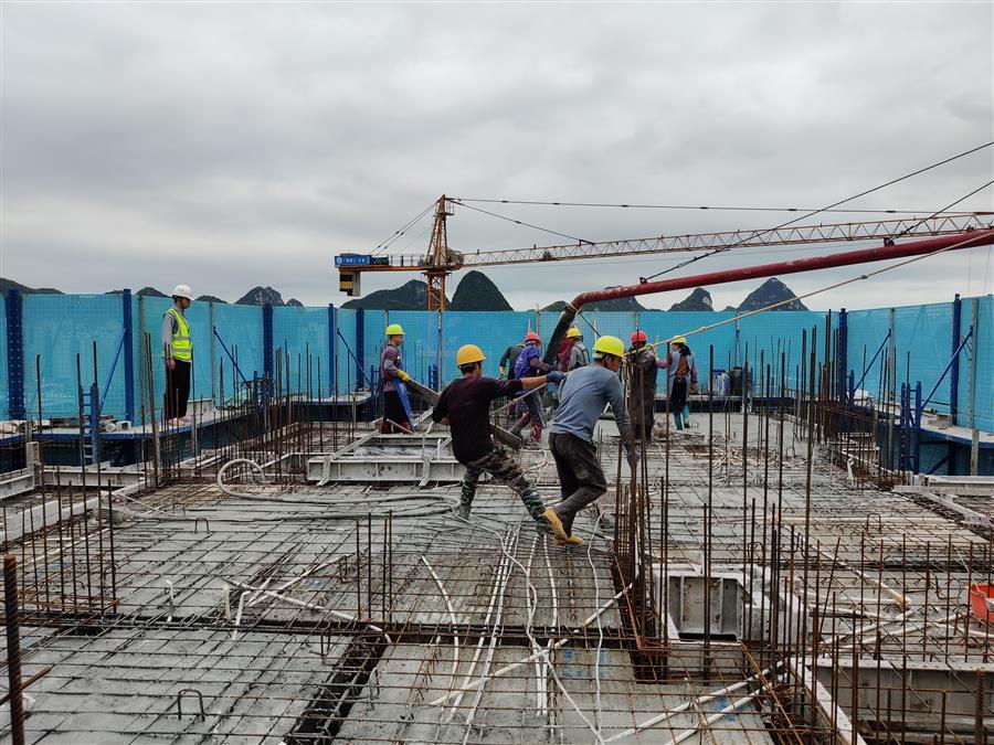 馬達(dá)聲、電鉆聲轟鳴,混凝土攪拌車(chē)、混凝土泵車(chē)、材料運(yùn)輸板車(chē)、土方綠皮車(chē)來(lái)往穿梭,綁扎鋼筋、混凝土塌落度試驗(yàn)、澆筑混凝土、升爬架前驗(yàn)收等工作有條不紊進(jìn)行,這是第四分公司融創(chuàng)江南林語(yǔ)項(xiàng)目的趕工現(xiàn)場(chǎng)。
