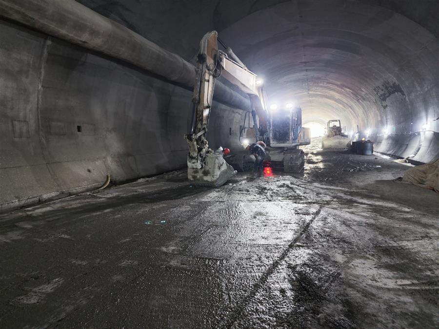 在施工現(xiàn)場(chǎng),機(jī)器轟鳴,挖掘機(jī)正在對(duì)隧道明洞部分的土方進(jìn)行開挖,出渣車有序作業(yè)外運(yùn)渣土;工人們正有條不紊地焊接、搭建地連墻鋼筋籠;在隧道深處,一臺(tái)挖掘機(jī)在操作人員的操控下,正揮動(dòng)著“手臂”,配合著工人在對(duì)隧道路面做清理?!盀榧涌祉?xiàng)目施工進(jìn)度,我們采取人員倒班、設(shè)備不停,白天晚上不間斷施工。”項(xiàng)目經(jīng)理介紹說(shuō),目前隧道工程已全面貫通,爭(zhēng)取在春節(jié)前完成仰拱和墻供二襯砼澆筑。