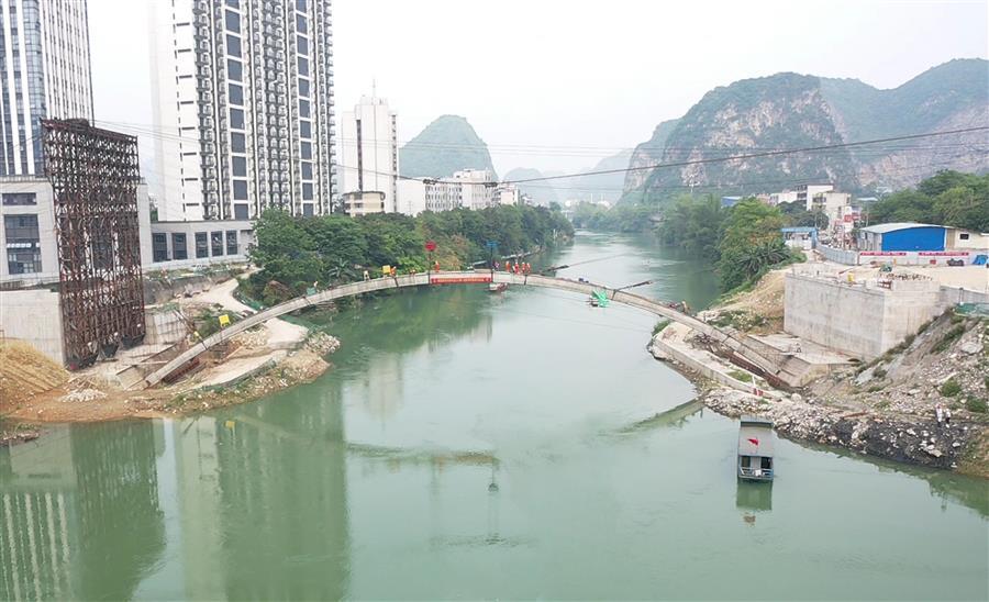 8:28分,隨著現(xiàn)場指揮員一聲口令,首條拱肋最后一節(jié)砼拱箱被纜索吊緩緩吊起,向橫跨在龍江河上的主拱圈移動。25分鐘后,第七片拱箱精準(zhǔn)吊裝就位,河池市龍江六橋(輝樂橋)首條拱肋順利合攏。