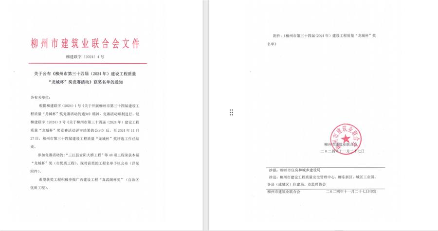 11月28日,柳州市建筑業(yè)聯(lián)合會(huì)公布柳州市第三十四屆(2024年)建設(shè)工程質(zhì)量“龍城杯獎(jiǎng)”競(jìng)賽活動(dòng)獲獎(jiǎng)名單和2024年柳州市建設(shè)工程優(yōu)質(zhì)結(jié)構(gòu)獎(jiǎng)名單,由冶建公司承建的三江縣宜陽(yáng)大橋工程等4項(xiàng)工程榮獲“龍城杯”獎(jiǎng);柳州市柳東新區(qū)明德小學(xué)項(xiàng)目(一期)等2項(xiàng)工程獲柳州市“優(yōu)質(zhì)結(jié)構(gòu)獎(jiǎng)”。