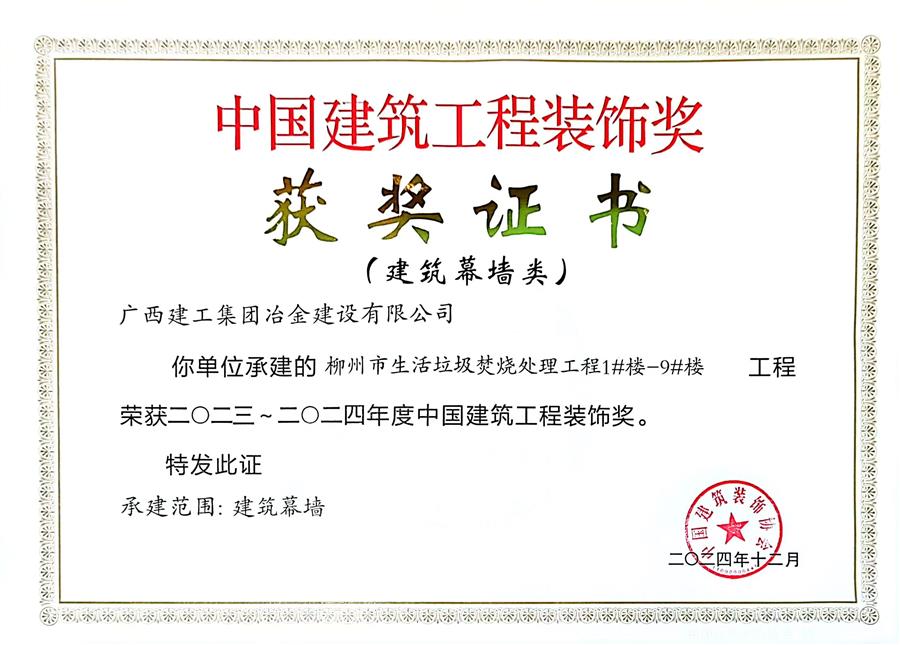 12月10日,中國(guó)建筑裝飾協(xié)會(huì)九屆四次理事會(huì)九屆六次常務(wù)理事會(huì)暨中國(guó)建筑裝飾協(xié)會(huì)成立40周年大會(huì)在北京召開,冶建公司承建的柳州市生活垃圾焚燒處理工程1#樓-9#樓獲2023—2024年度“中國(guó)建筑工程裝飾獎(jiǎng)”。至此,冶建公司已經(jīng)七奪“中國(guó)建筑工程裝飾獎(jiǎng)”。